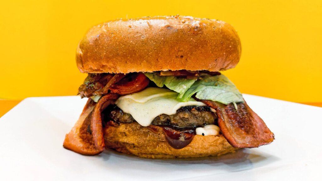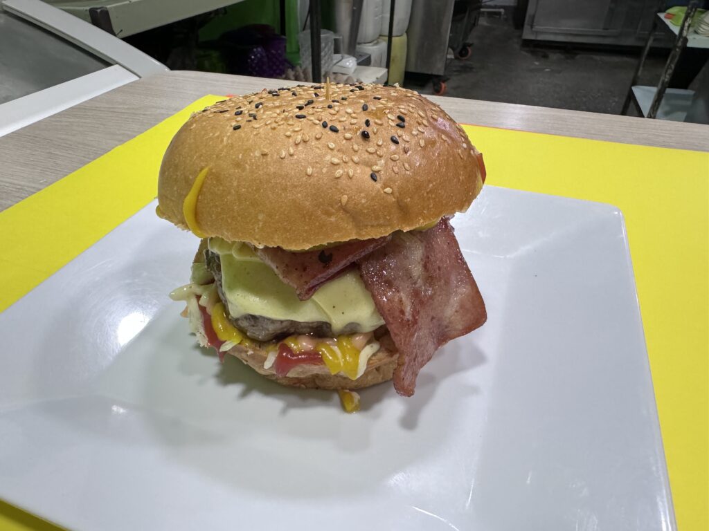 Pan artesanal, Carne de 200g, Queso, Tocineta, Chorizo, Pepinillos, Lechuga, Tomate, Cebolla en salsa BBQ y Salsas. NORMAL: $20.000 COMBO (Normal + Papas + Gaseosa) $28.000