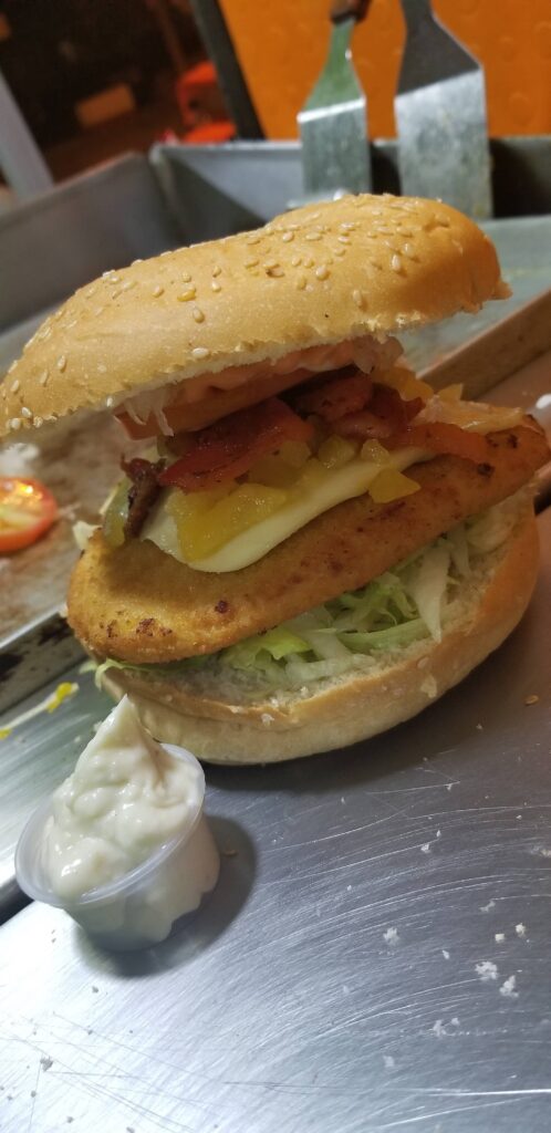 Filete de pollo, Queso, Piña, Tocineta, Lechuga, Cebolla, Tomate y Salsas. NORMAL: $18.000 DOBLE: $25.000 COMBO 1 (Normal + Papas + Gaseosa) $26.000 COMBO 2 (Doble + Papas + Gaseosa) $33.000